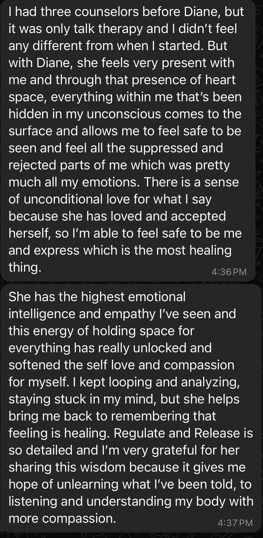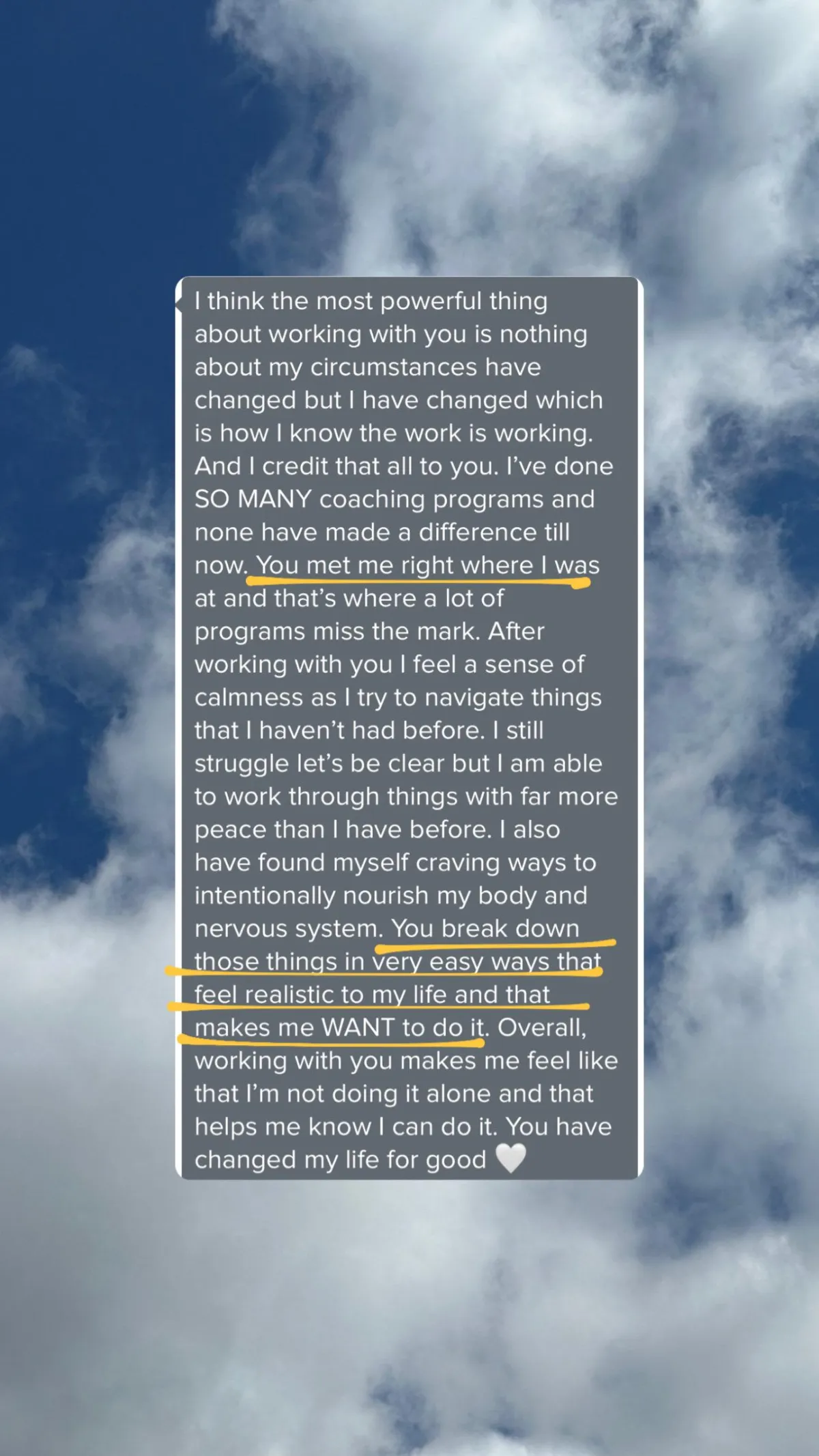 💫 Less Anxious in Your Body: That constant undercurrent of tension? The racing thoughts or tight chest? Imagine being able to finally exhale. You'll feel calmer in your body, more at ease in your skin, and better able to move through life with a sense of peace and safety.